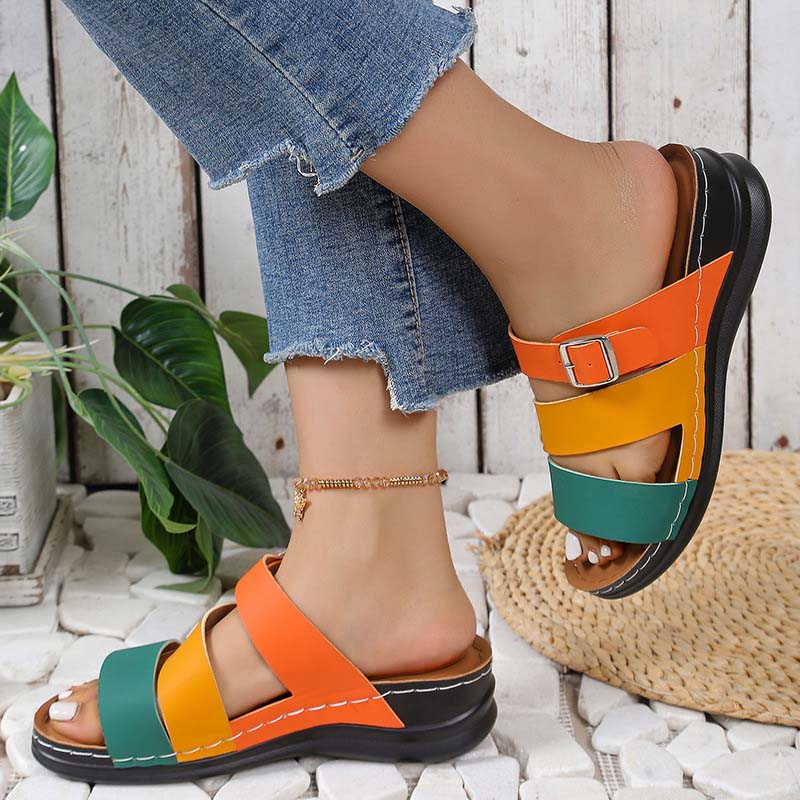 STIJLVOL COLORBLOCKING DESIGN : Deze damesslippers met colorblocking en dikke hak geven je garderobe een moderne en chique look. De opvallende kleurencombinaties van zwart, oranje en wijnrood maken deze sandalen de perfecte accessoire voor elke casual of semi-formele gelegenheid. Het gedurfde design voegt een vleugje mode toe aan je dagelijkse outfits.