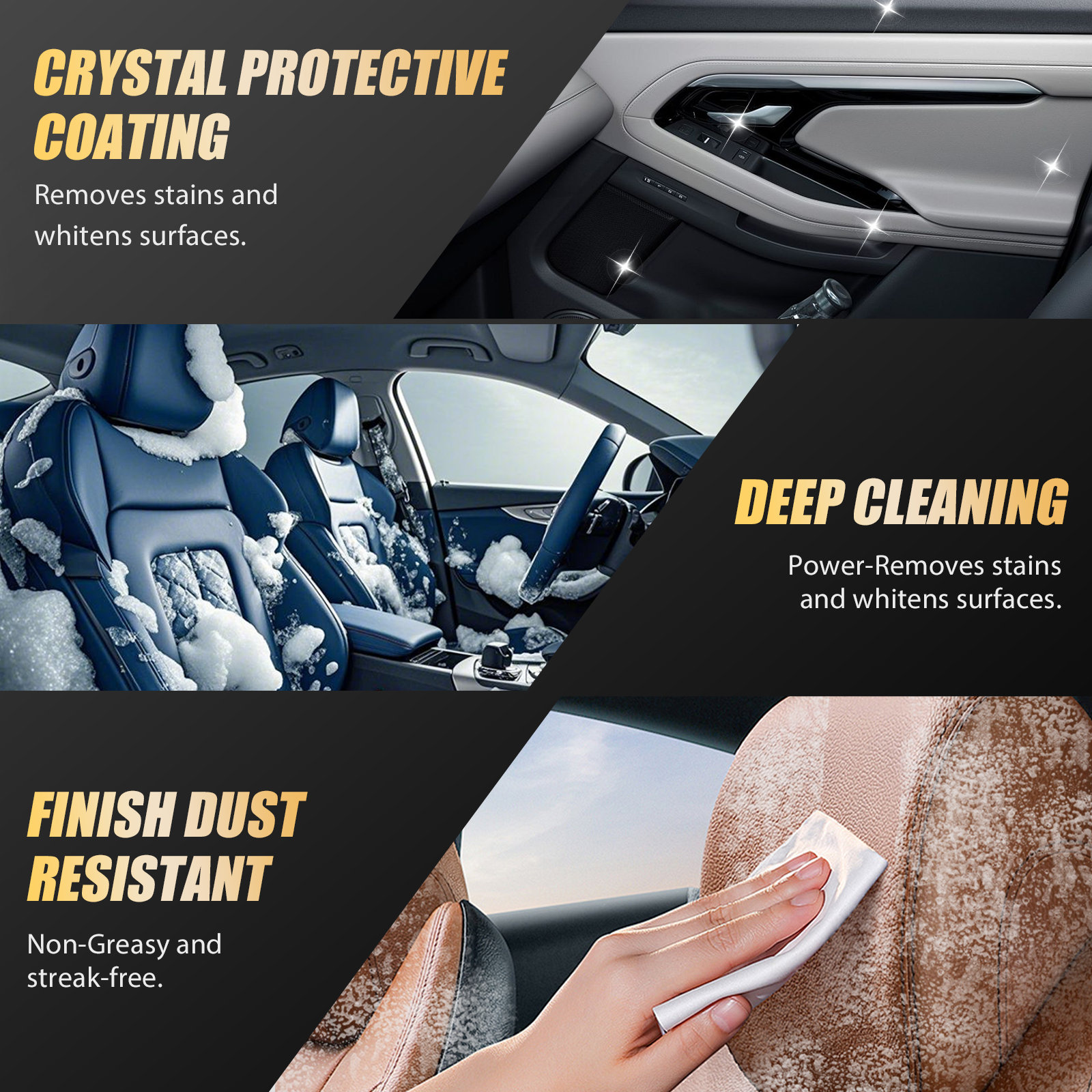 Niet-vettige en stofafstotende afwerking: In tegenstelling tot sommige reinigers die een vettig laagje achterlaten, zorgt deze Interieurreiniger voor auto's voor een schone, niet-vettige afwerking. Het oppervlak blijft glad en gemakkelijk aan te raken, zonder stof of vuil aan te trekken. Dit betekent dat het interieur van je auto langer schoon blijft, waardoor je minder vaak hoeft schoon te maken en een frisse, stofvrije omgeving behoudt.