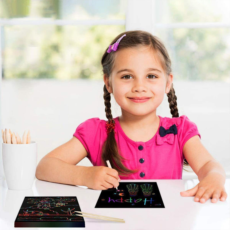 EINDELOZE CREATIVITEIT: Deze kunstset biedt een leuke en boeiende manier om je creativiteit de vrije loop te laten. Kras het zwarte oppervlak weg om de levendige regenboogkleuren eronder te onthullen, zodat je met elke kras prachtige en unieke ontwerpen kunt maken.