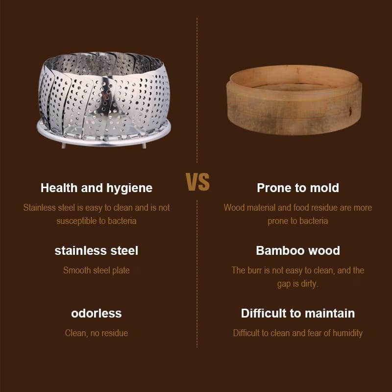 [ROESTVRIJ STAAL] De opvouwbare stoompan is gemaakt van hoogwaardig roestvrij staal van voedingskwaliteit, dat roestvrij, duurzaam en onschadelijk is. De dichte kleine gaatjes aan de onderkant zorgen voor een gelijkmatige verwarming. Aan beide zijden bevinden zich handvatten die bescherming bieden tegen verbranding.