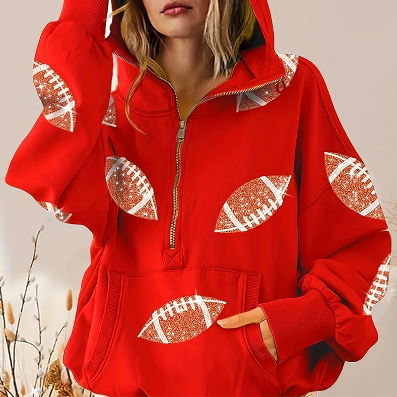 OPVALLENDE SEQIN DETAILS: Versierd met een dynamisch rugby-geïnspireerd seqin motief. Deze hoodie transformeert in een instant van dag- naar avondkleding. De glinsterende versieringen reflecteren het licht bij elke beweging, zodat u met vertrouwen en unieke stijl opvalt.