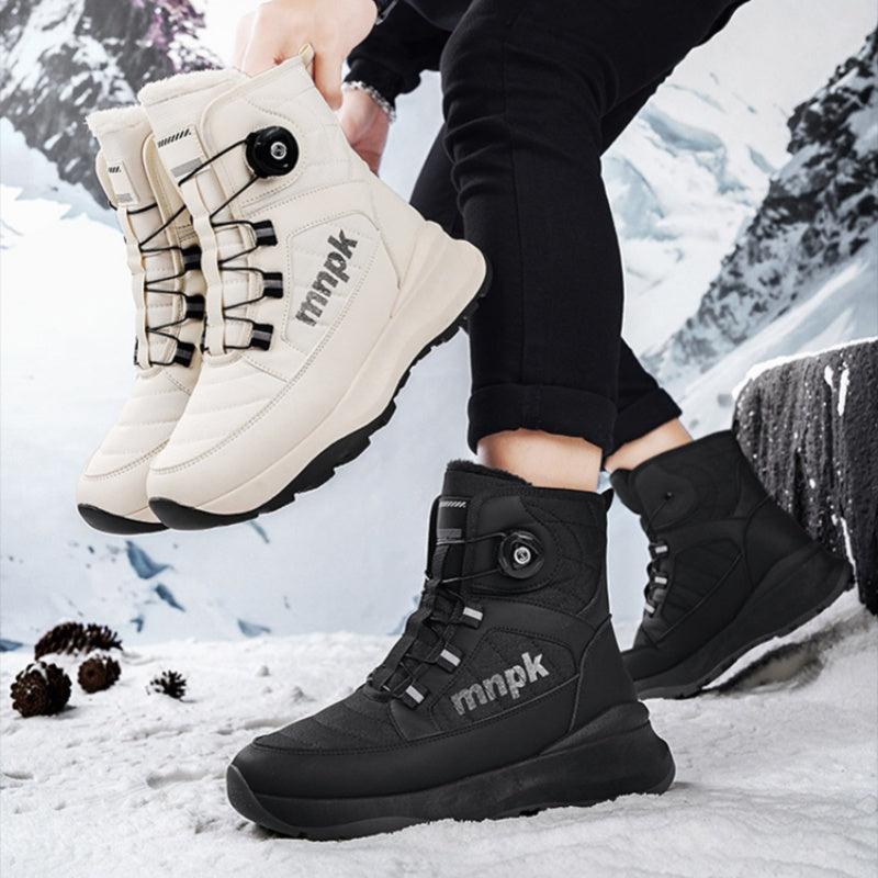 HANDIG DRAAIEND GESPONTWERP: Dankzij de draagbare, draaibare gesp zijn deze sneeuwlaarzen gemakkelijk te gebruiken. Trek gewoon om los te maken, draai om vast te maken en druk om te vergrendelen, zodat je ze moeiteloos kunt vastzetten.