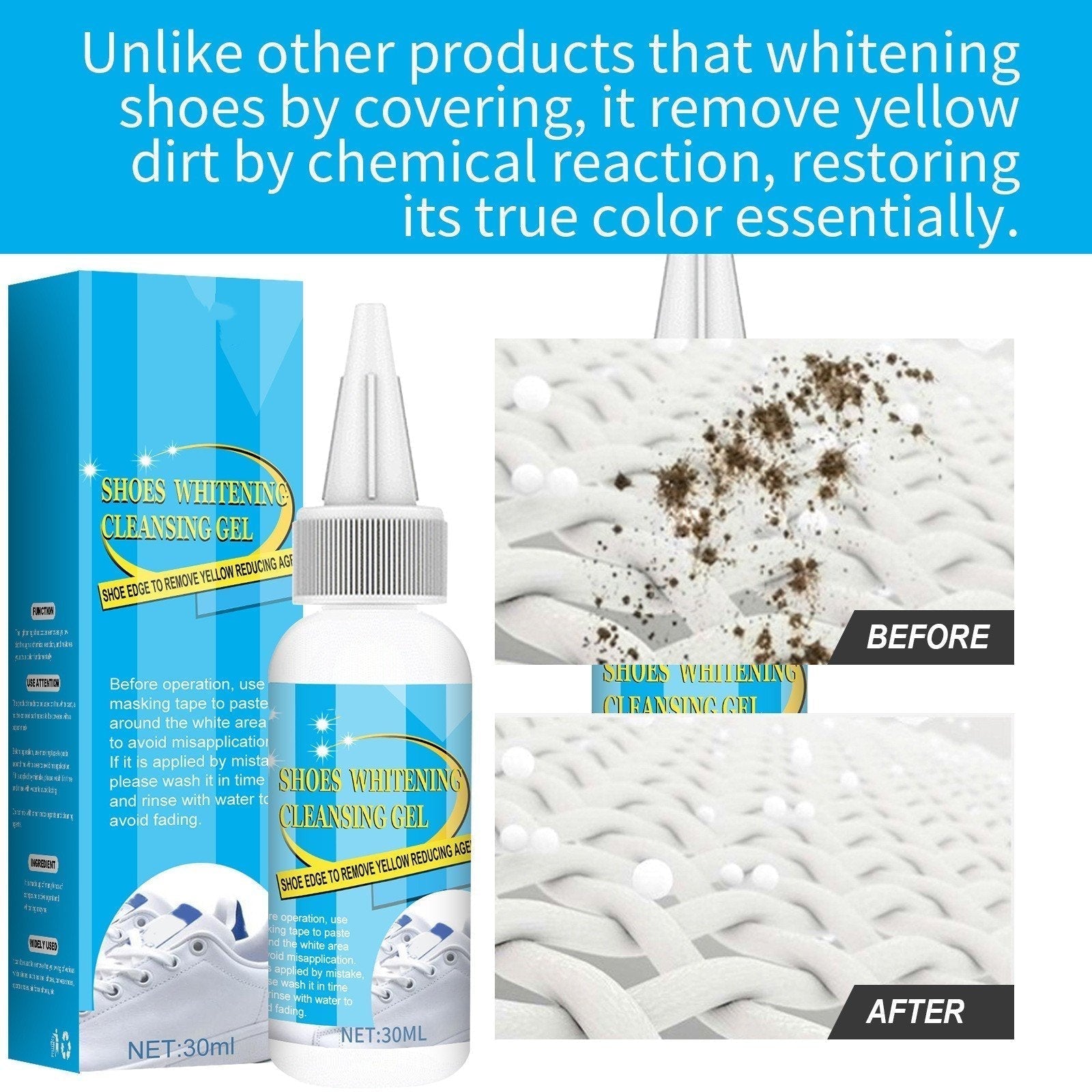 Zodra vlekken en vergeling op uw schoenen verschijnen, zien ze er oud, lelijk en vuil uit. Onze "Schoen Witmakende Gel" is een hoogwaardig product dat vuil en vergeling uit uw schoenen verwijdert en effectief de helderwitte uitstraling behoudt!
