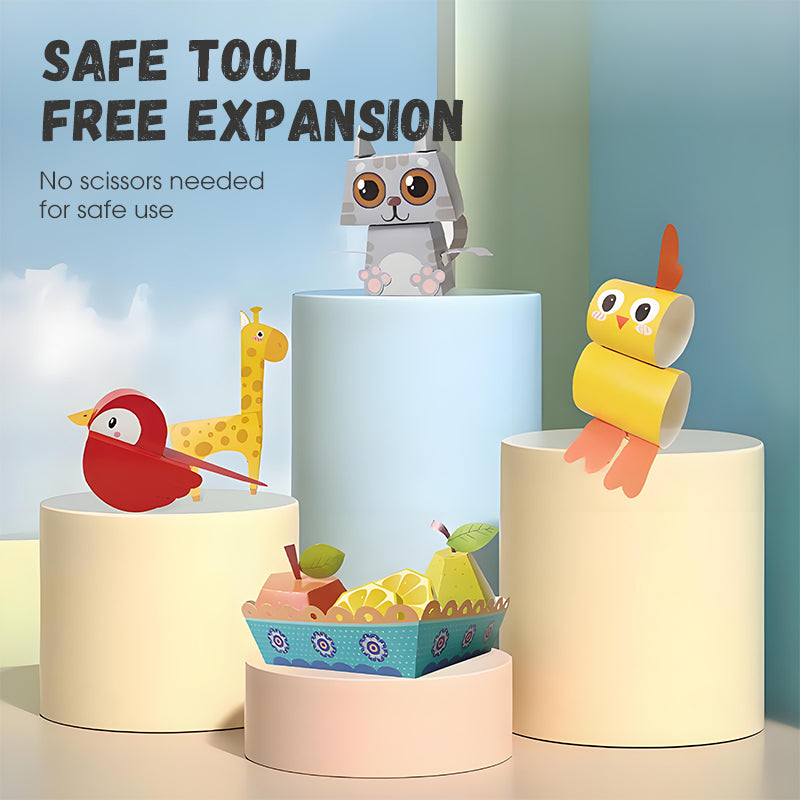 VEILIG EN HULPMIDDELEN-VRIJ ONTWERP: Veiligheid heeft de hoogste prioriteit. Het boek maakt gebruik van een stansproces met papieren membranen die ingebouwde snijlijnen bevatten, waardoor het gebruik van scharen overbodig is. Dit maakt het perfect voor jonge kinderen, zodat ze van origami kunnen genieten zonder het risico op snijwonden, en biedt ouders gemoedsrust.