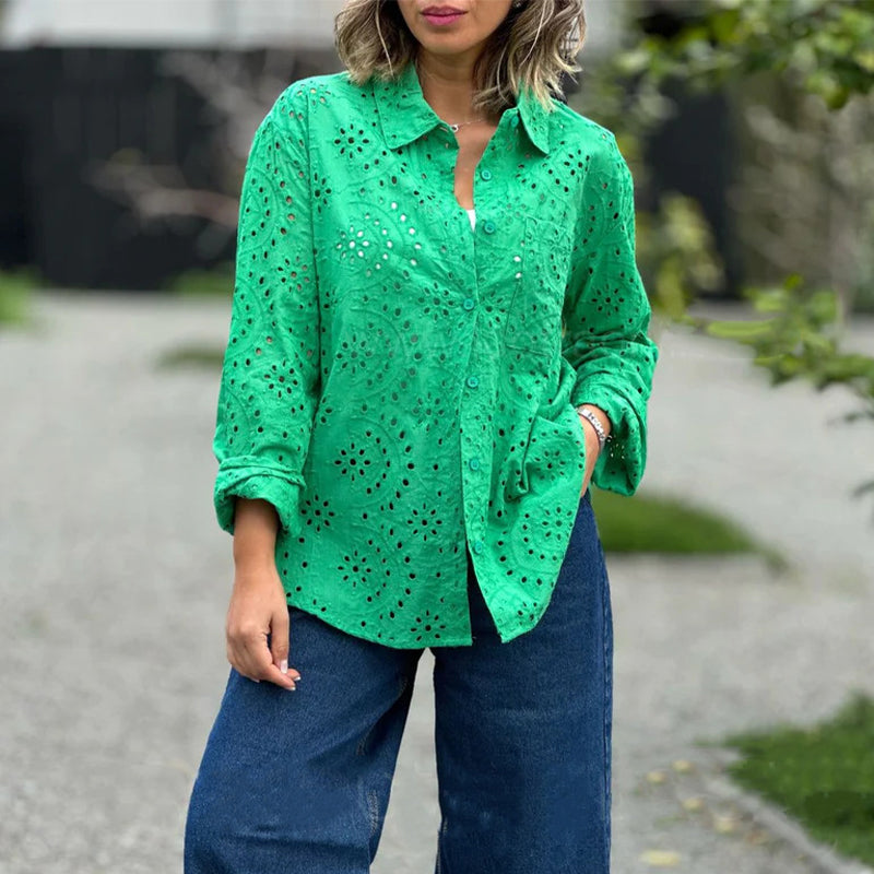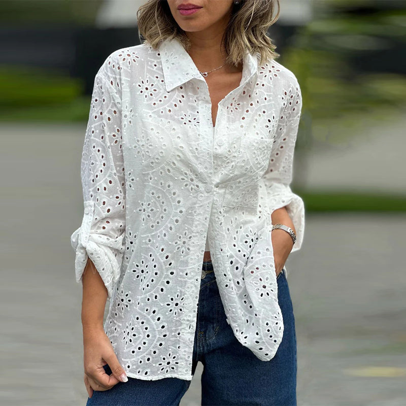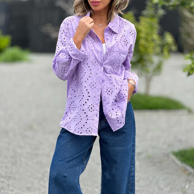 CHIC CUT-OUT DESIGN - UNIEKE BLOEMENDETAILS: Een delicate bloemenhalslijn voegt een vleugje charme en vrouwelijkheid toe. Dit opvallende detail versterkt het algehele ontwerp en creëert een perfecte balans tussen elegantie en moderne trends.